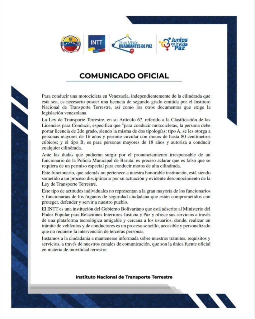 El presidente del INTT, Gabriel Arístides Aguana Rodríguez, informó que es falso que se requiera de un permiso especial para conducir motos de alta cilindrada, como aseguró un funcionario de la Policía de Baruta.