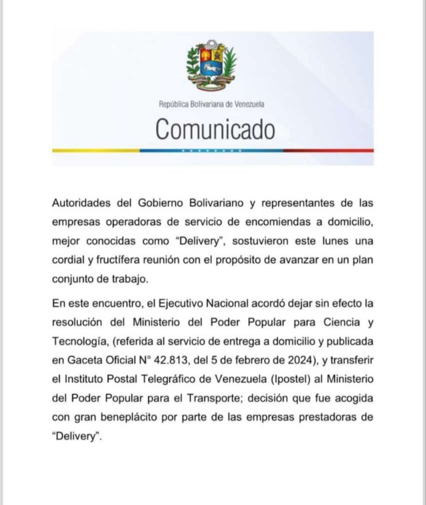 Sin efecto Gaceta Oficial que regulaba el servicio de envío de las compañías de Delivery aquí el comunicado del Gobierno Nacional: